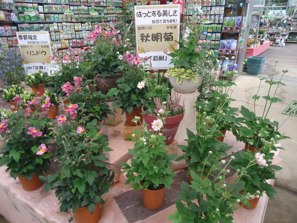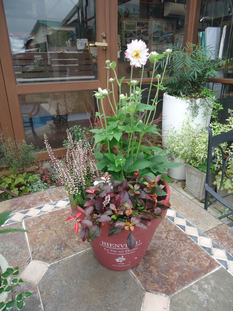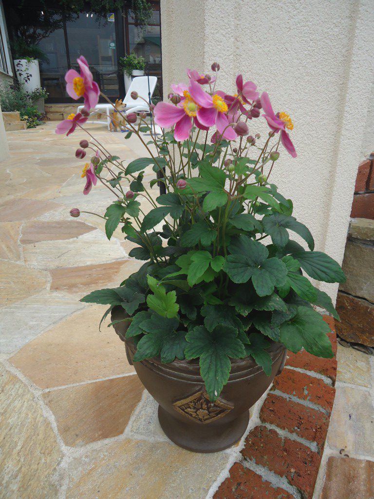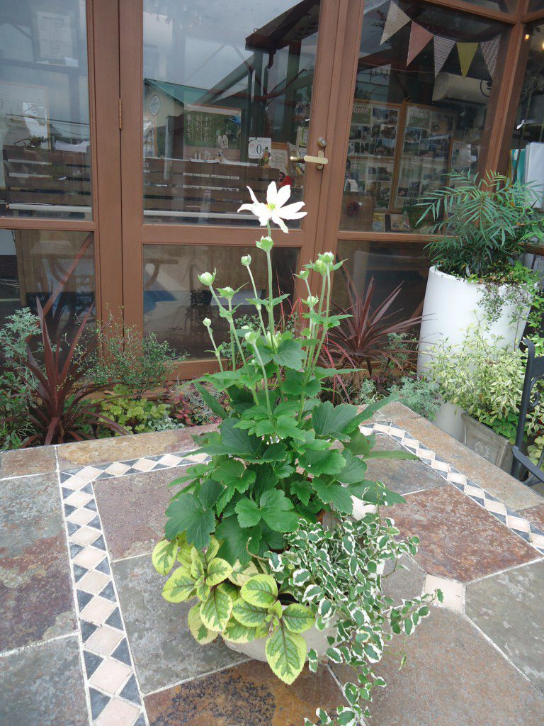 涼しい風に吹かれながら秋明菊を簡単な寄せ植え風にアレンジしてみました。