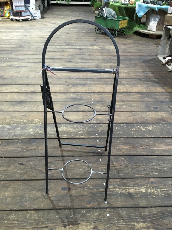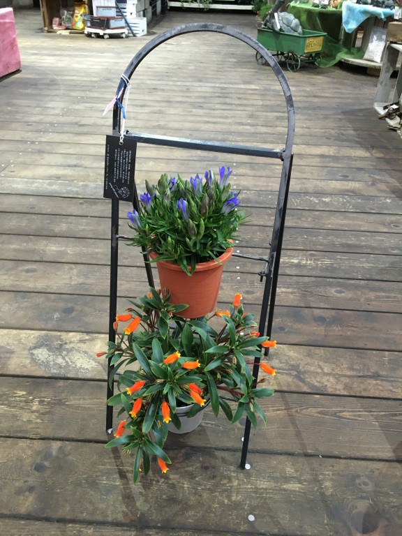 もうひとつ、こちらも小さめの鉢花を2ついっぺんにたのしめる、アイアン仕様のポットスタンドです。