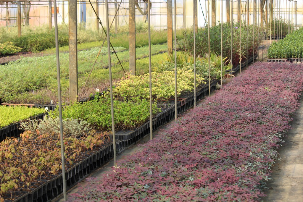 温室内ではパッチワークのような色合いで整然と植木が並べられていました。