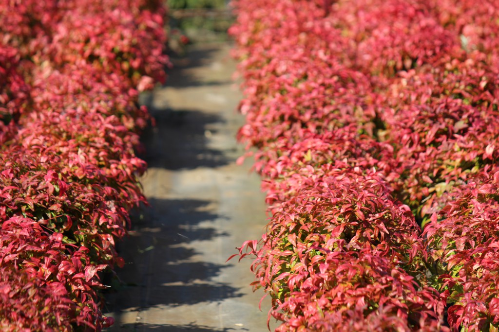 真っ赤に染まった「ナンテン ブラッシュピンク」 新芽はピンクに染まり晩秋は真っ赤に染まる。
