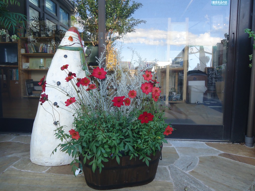 クリスマスっぽく、『エレモフィラニベア』と木製鉢に入れて、スノーマンと一緒に並べてみました。
