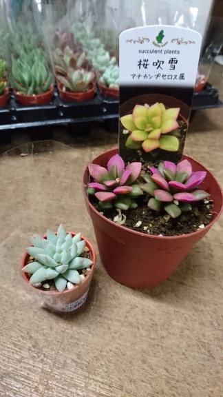 多肉植物入荷情報 - 秦野市・平塚市・伊勢原市で観葉植物・多肉植物・ガーデニング雑貨・草花をお探しなら品揃え豊富な木村植物園におまかせ - 2016年12月08日 / 入荷情報:新着 セダム・多肉植物 鉢花・観葉植物 今日はとても寒いですね。 久しぶりに多肉植物入荷情報です。 担当のオススメは樹氷(左)です。 寒くなると葉先がピンクに染まって、パステルカラーがとっても可愛らしいです。 桜吹雪も綺麗なお色です。普段は高額品種で入荷しますが、今回は通常品種として入荷でお安いです!2つだけ入れてもらえました〜╰( º∀º )╯ 他にもエケベリア系がちょこちょこっと入荷しております。 良かったら覗きに来て下さい。お待ちしております<(_ _)>