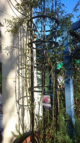 つるバラは、ツルをできるだけ水平にすると、枝のあちこちから芽が伸びて、