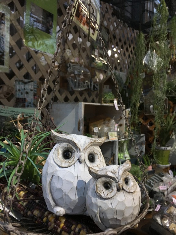 白いアンティーク調のフクロウ、大小サイズとも人気ですよ〜