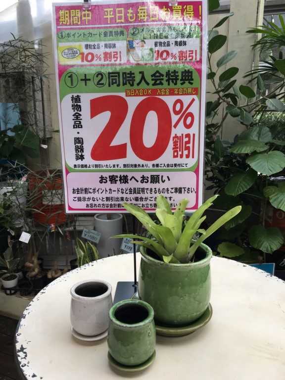 まだまだやってます、ガーデニング祭期間中は、ポイントカードとメルマガorLINE@、両方入会で20%オフ!