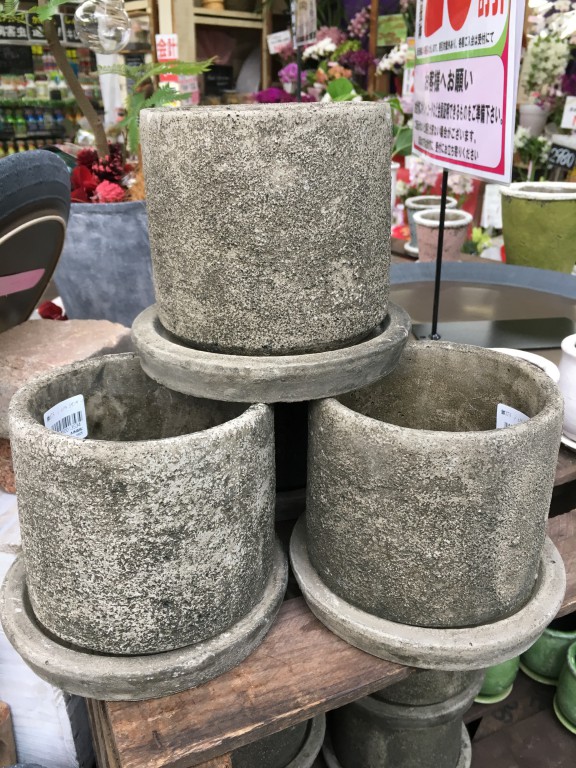 ↑上2つの鉢はシンプルなストーンポットですが、ピンク水色グリーン白と、落ち着いた優しい色合いが特徴です