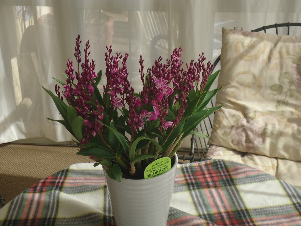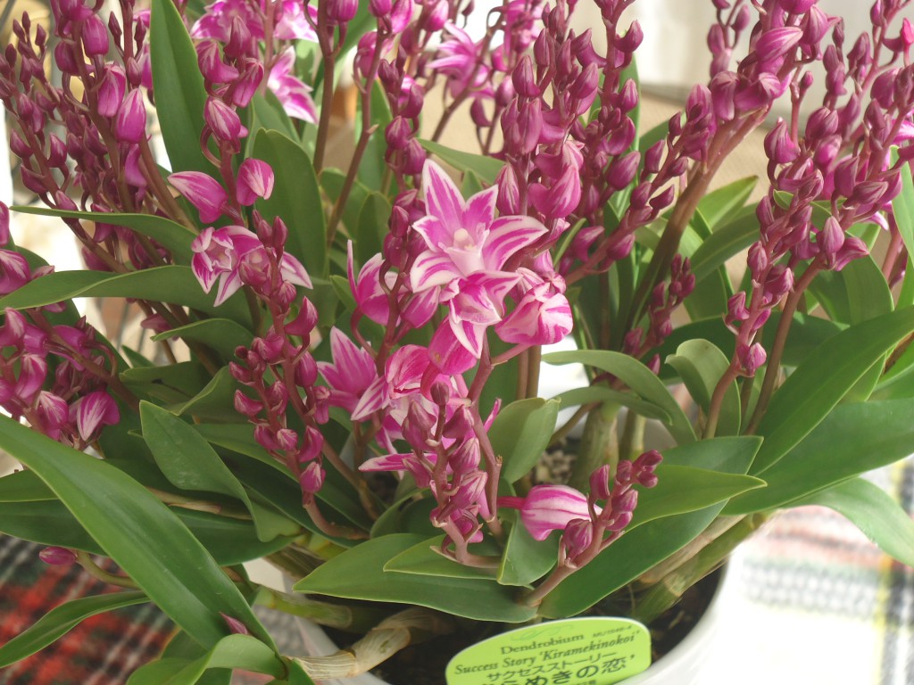同じくワインカラーのしぼりが入った、ギンギアナム系デンドロビウム『きらめきの恋』