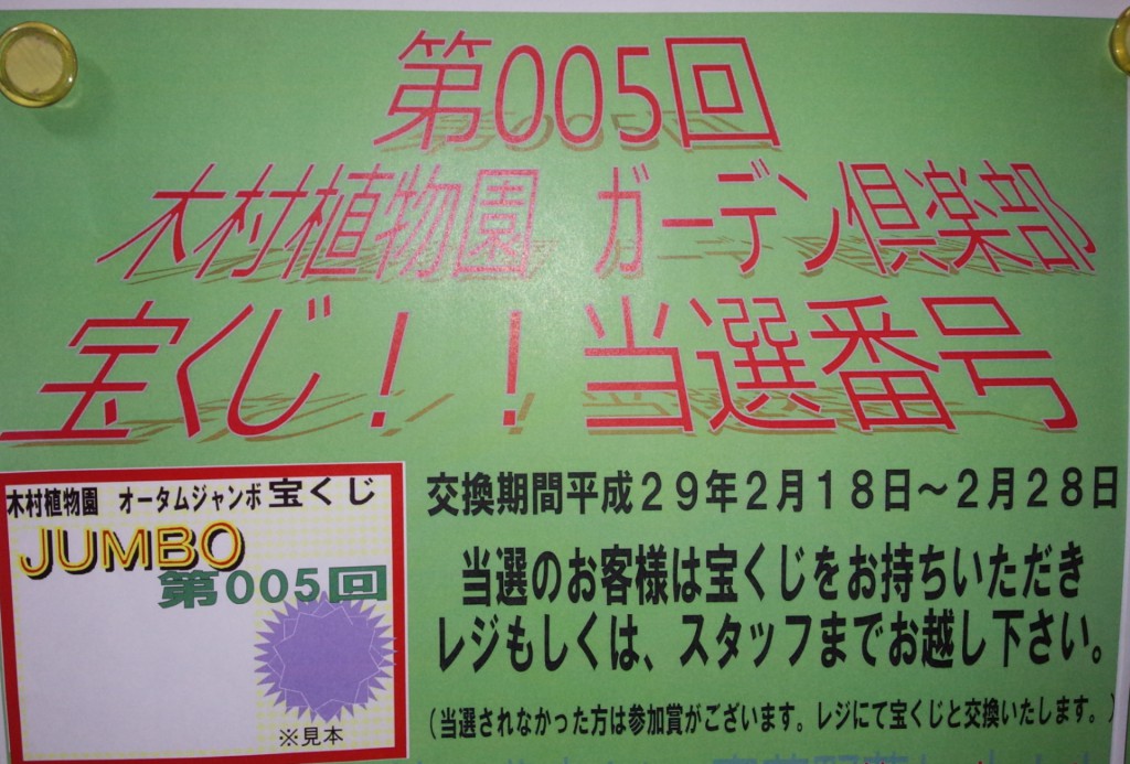 宝くじ!!当選番号発表 - 秦野市・平塚市・伊勢原市で観葉植物・多肉植物・ガーデニング雑貨・草花をお探しなら品揃え豊富な木村植物園におまかせ - 2017年02月19日 / イベント・感謝祭 こんばんは! 先日のガーデニング祭りで受付にてお渡ししました《宝くじ》 只今、当選番号の発表と、商品の交換をいたしております(´▽`)ノ 当選番号はレジ前のホワイトボード掲示板にて発表 交換期間は今月28日までですのでお早めにご確認下さいね~ また、当選されなかった方にも参加賞が!!