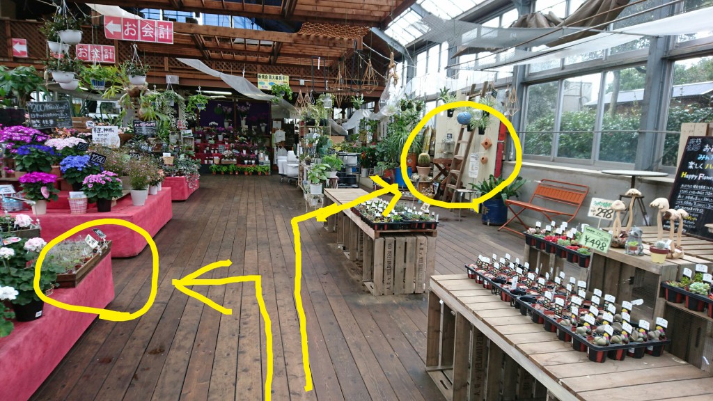 温室内の大通りの一つ目の山を左に曲がると多肉植物売場です。ガステリアやハオルチアが少し入ってます。