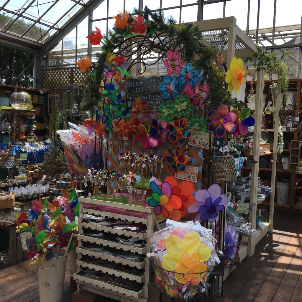 かざぐるま好評発売中☆ - 秦野市・平塚市・伊勢原市で観葉植物・多肉植物・ガーデニング雑貨・草花をお探しなら品揃え豊富な木村植物園におまかせ - 2017年04月30日 / 雑貨・インテリア ガーデンアイテム 雑貨・ガーデンアイテム すっかり暖かく、ちょっと陽射しがきつくて汗ばむような日々ですが、 風を感じるあのアイテム揃ってます! かざぐるま! お子様も持ってたのしい、可愛らしい、カラフルなタイプたくさんあります。 お庭におっきな風車一本、いかがですか? もちろんモグラ対策にもʕ•ᴥ•ʔ 玄関の寄植えに添えられるピックタイプも可愛いですよ〜^_^ GW、温室内雑貨コーナーでお待ちしております!