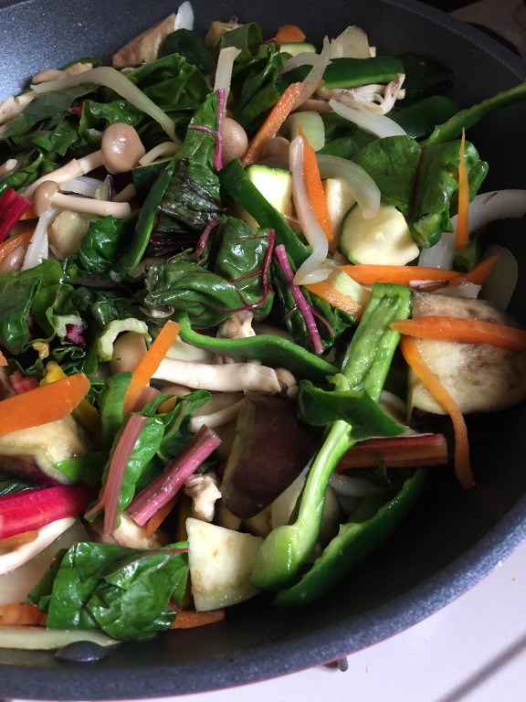 もう一つ、手軽でオススメは野菜炒め。夏野菜にバジルやスープセロリなどを入れ、ナンプラーやオイスターソース、カレー粉など、お好みの調味料で炒めて、仕上げにレモンを絞ります。仕上げにミントとかレモンバームなんかを飾って…おぉ、それっぽい!