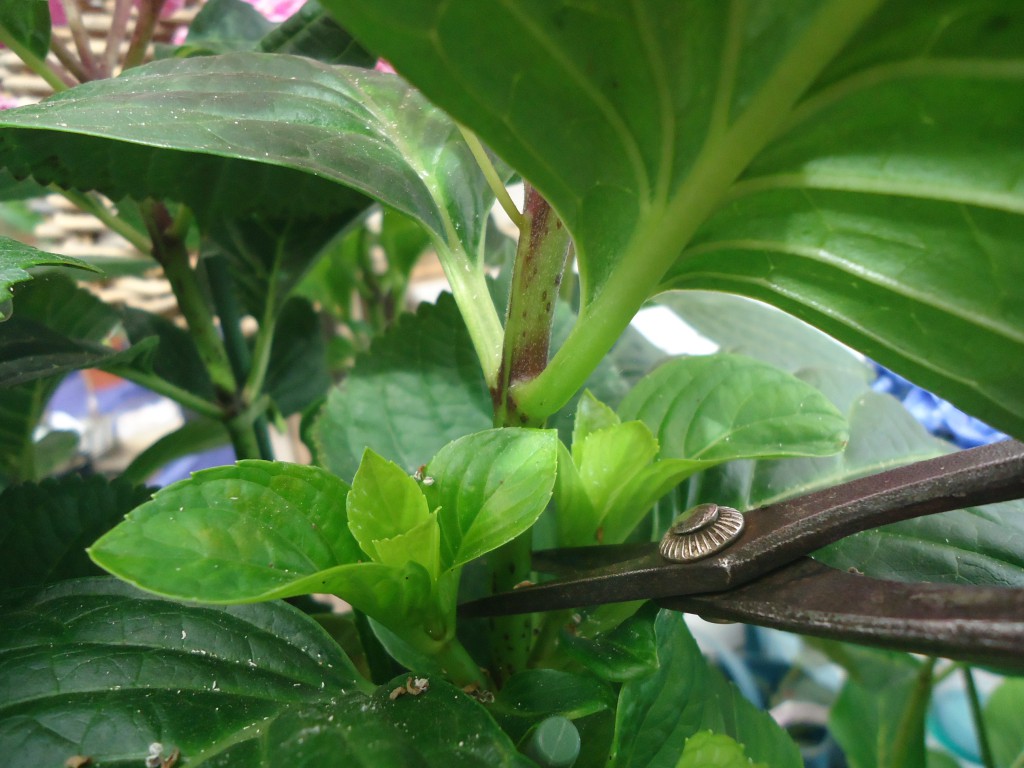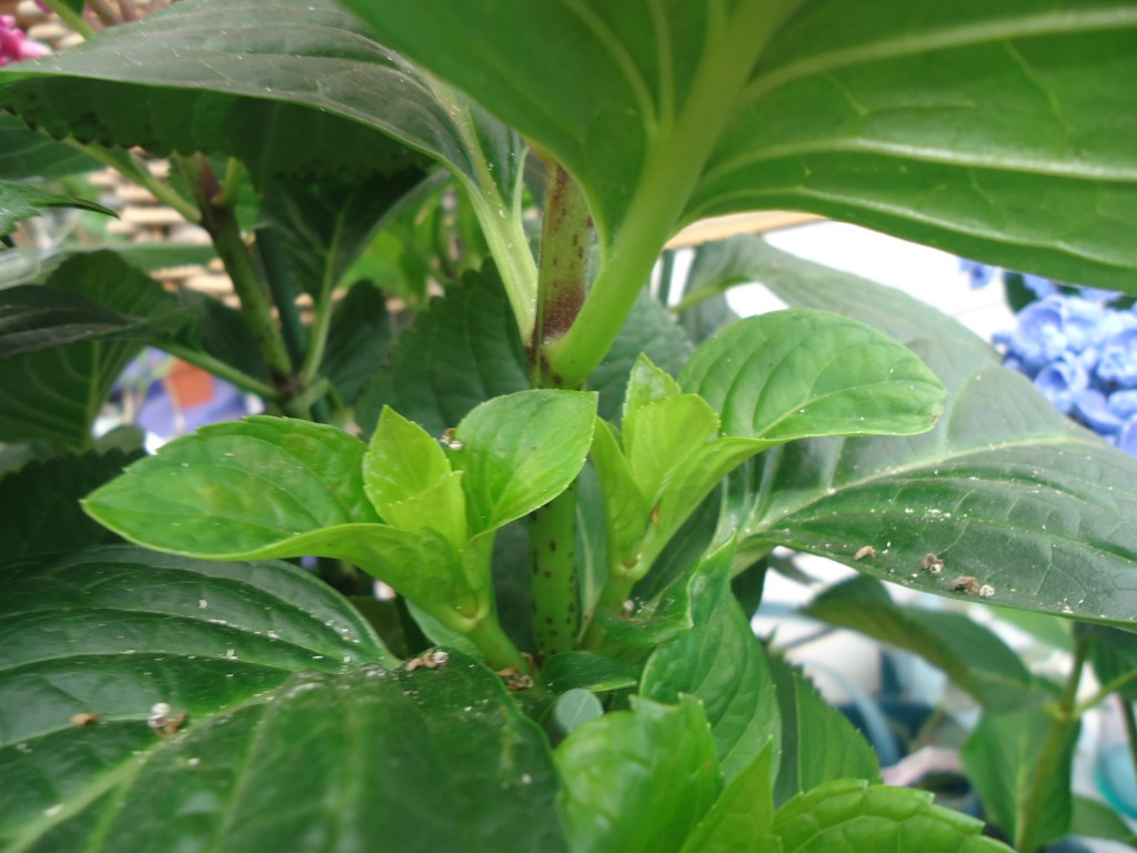 この時期、鉢植えのアジサイを良く見ると、花の下に新しい芽がでています。