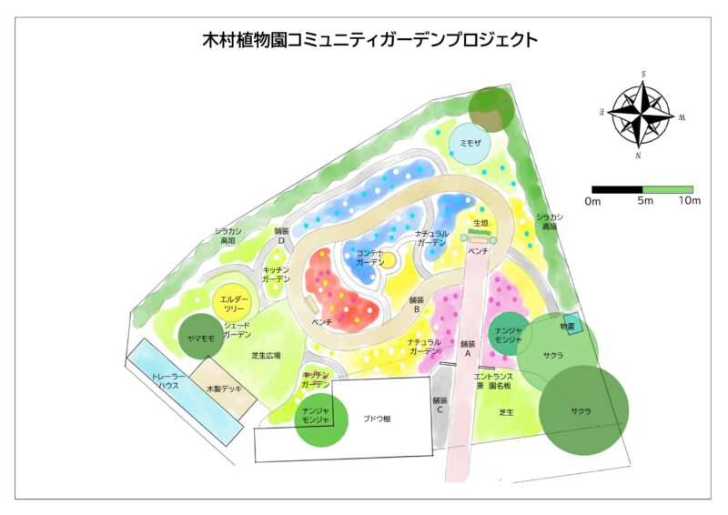 今後のコミュニティガーデンのイメージ図は、このような形を予定しています。園内には四季折々の植物が植えられ、季節ごとに異なる表情を楽しめる空間へと生長していきます。時間の経過とともに景色が変わり、訪れるたびに新たな発見があるのも魅力の一つです。完成後も育てながら進化していくガーデンを、ぜひ楽しみにしていてください。