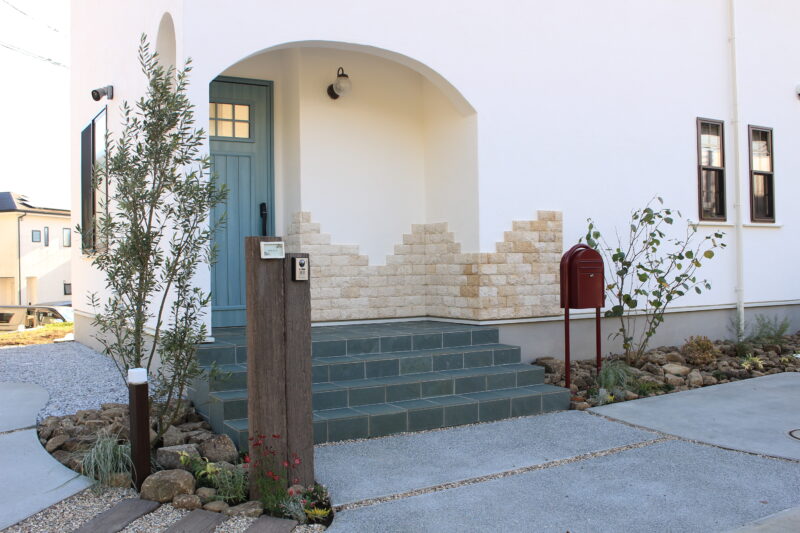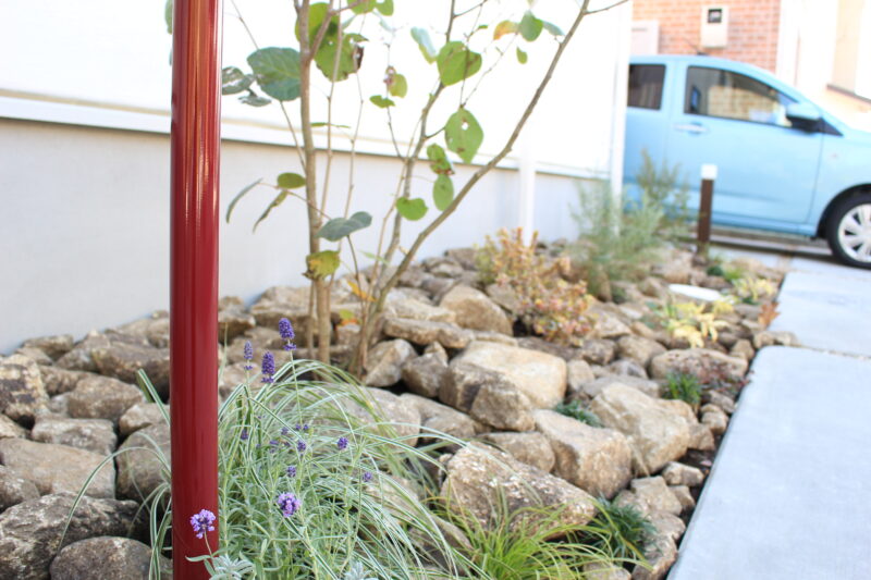 エントランスに施されたレンガの装飾や、ゴツゴツとした自然石のロックガーデン。
