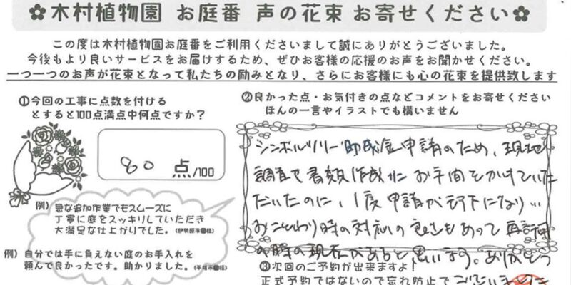 シンボルツリー助成金申請のため、現地調査や書類作成にお時間をかけていただいたのに、一度申請が却下になり...おことわり時の対応の良さもあって再許可の時の現在があると思います。ありがとうございました。