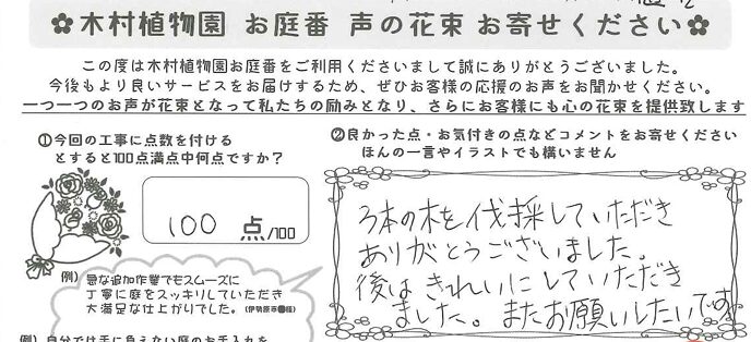 3本の木を伐採していただきありがとうございました。後はきれいにしていただきました。またお願いしたいです。