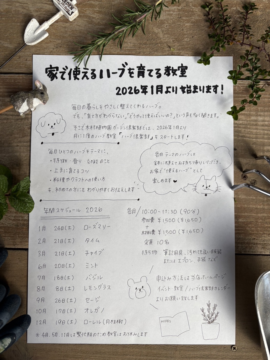 - 倶楽部の内容、日程、変更等、ホームページ、ブログからご確認いただけます。その他ご不明な点等ございましたら「ガーデン倶楽部(ハーブ倶楽部担当)」までお問合せ下さい。(TEL:0463-59-0870)