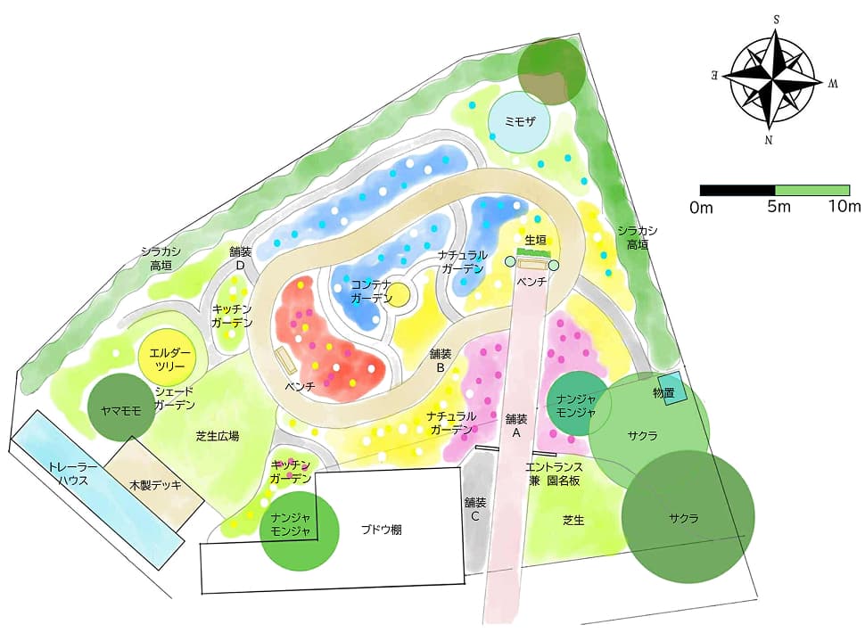 みんなで「どんな植物を植えたい?」とイメージや具体的な植物なども挙げてもらいながら 作った「花笑みの庭」は、エリアごとに色分けして、季節が進むたびに様々な 宿根草の花がリレーのように咲いていきます。