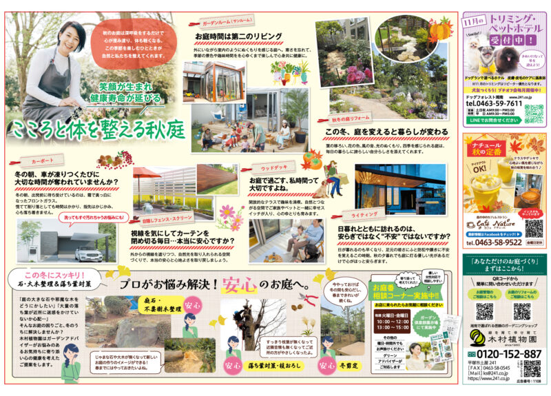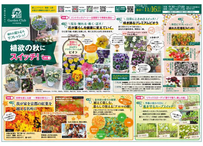 広告・キャンペーン・イベント情報お庭のお手入れ お庭番 木村植物園グループ広告 チラシ期間2025/10/22-11/16 疲れた庭も心もリフレッシュ! 植欲の秋にスイッチ!ON/笑顔が生まれ 健康寿命が延びる こころと体を整える秋庭 チラシ期間2025/9/1-2025/12/31 庭づくりは健康づくり 秋冬ガーデンで始める新習慣①/庭づくりは健康づくり 秋冬ガーデンで始める新習慣② ガーデン倶楽部通信 【お庭番コラム】秋のお庭でほっこり安心、笑顔も健康も育てよう![2025年9月号4] 【ステキなお庭づくりの物語】お庭の第二章!お庭好きのメンテナンスフリーなお庭[2025年9月号3] \毎日を楽しく・美しく・元気にする/ 教室・体験会&花友づくり[2025年9月号2] 季節を運ぶ 秋の庭と鉢の楽しみ方[2025年9月号 1] これまでのガーデン倶楽部通信はこちら
