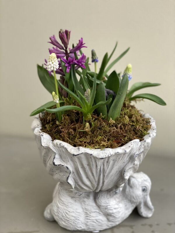 こちらは芽出し球根とハイゴケの寄せ植えをラビットが持ち上げてまーす