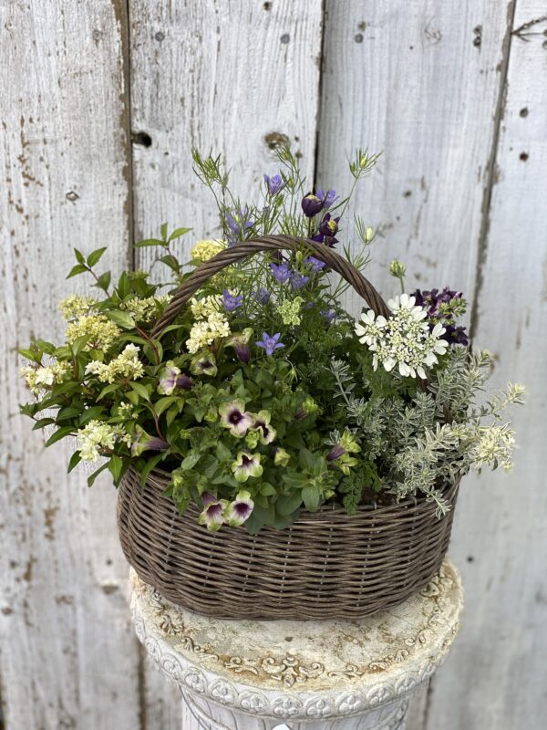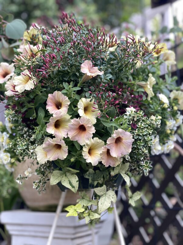 私も同じペチュニアを使って併設されてる「レストラン ナチュール」にハンギングバスケットを作って飾りました